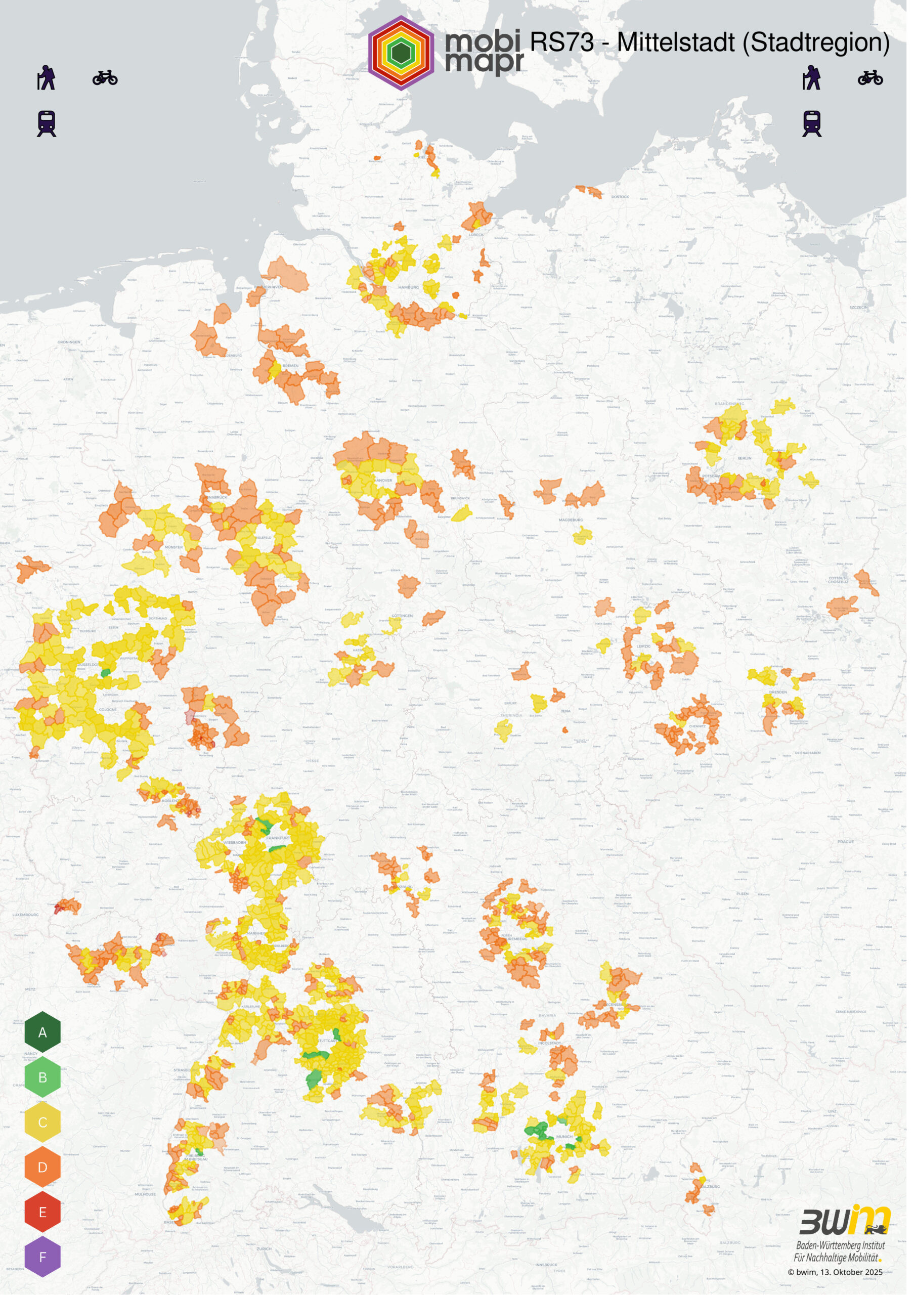 Die folgenden Karten zeigen die Mobilitätsqualität im Umweltverbund für die unterschiedlichen Regionalklassen – also, wie gut sich Wege zu Fuß, mit dem Rad oder mit öffentlichen Verkehrsmitteln bewältigen lassen.