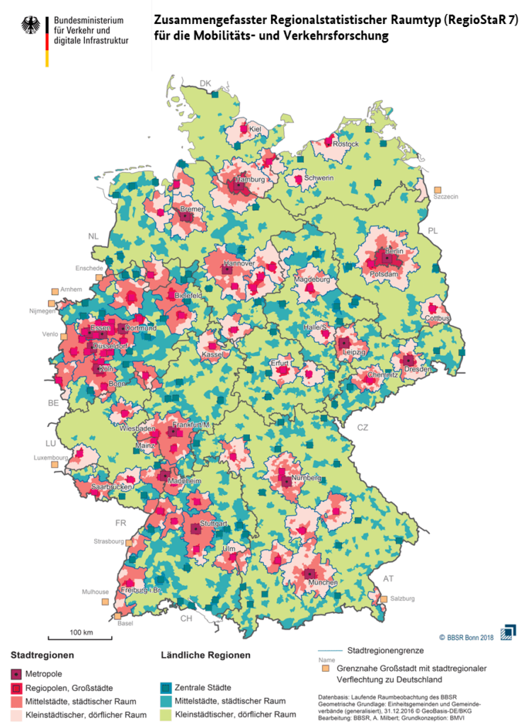 Dieser Beitrag soll zeigen, dass man das auch anders machen und dann – je nach Präferenz – Äpfeln mit Äpfeln bzw. Birnen mit Birnen vergleichen kann. Die nächsten Zeilen zeigen die Rolle der unterschiedlichen Regional-Klassen nach RegioStaR7-Klassifizierung.