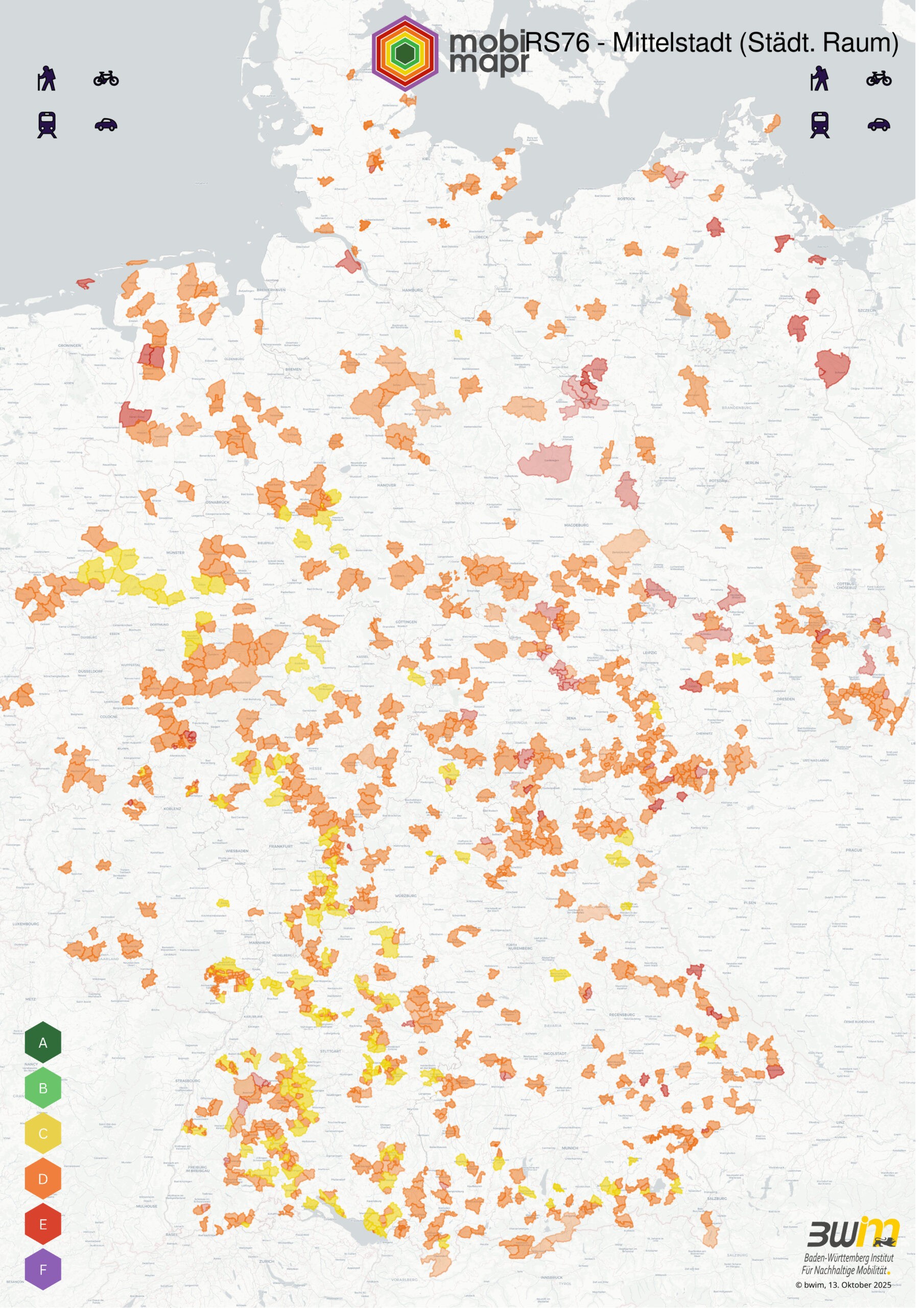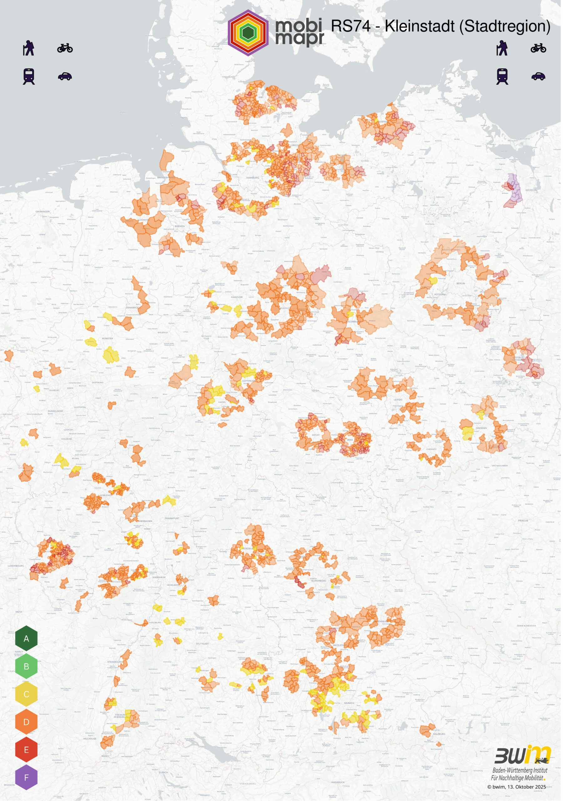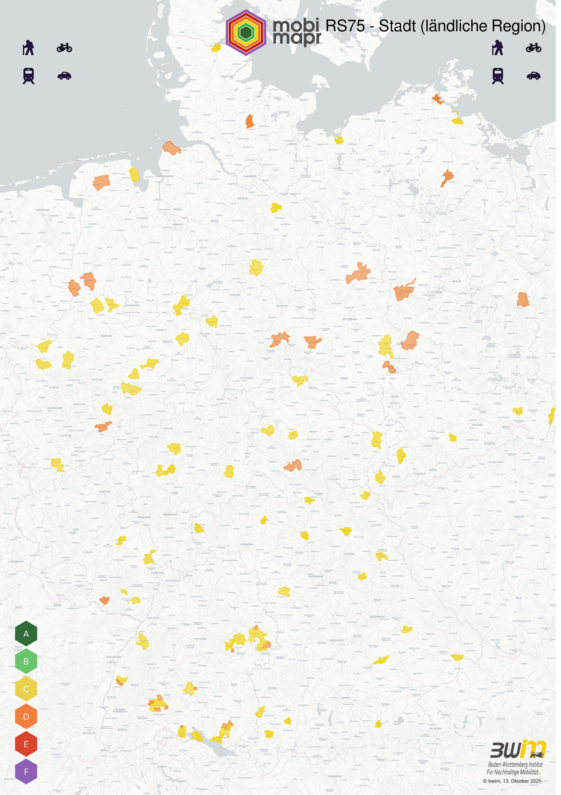 Die folgenden Karten zeigen die Mobilitätsqualität mit dem Umweltverbund, aufgegliedert auf die unterschiedlichen Regionalklassen.