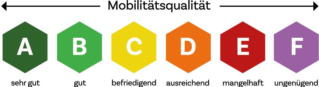Die Mobilitätsbewertung nach „Schulnotensystem“ von A (sehr gut) bis F (mangelhaft) basiert auf einem Scoringsystem, das erstmals objektive Erreichbarkeitsdaten eines hochauflösenden, deutschlandweiten Routings (Strecke, Zeit) mit subjektiven Qualitätsparametern (z.B. ADFC-Fahrradklima-Test, Beleuchtung, Wegbeschaffenheit) verknüpft.